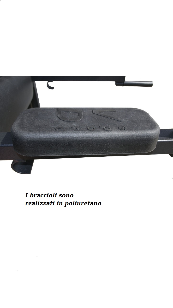 1. Il design è costituito da un profilo metallico più spesso, progettato per un peso di 150 kg, il peso dell'asta è di 100 kg. barra orizzontale con ampia presa; travi con fermi per la stampa, stare sotto la barra e una morbida schiena. I braccioli morbidi sono realizzati in poliuretano espanso, che ha una lunga durata.